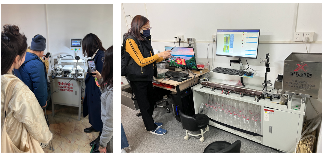 第三,AI 智能選色的自動化: 這是最讓我大開眼界的「黑科技」。過去挑顏色、分等級,需要大量資深師傅用肉眼長時間篩選。但在九傳,我們看到了一台 AI 視覺分選機。它能快速識別每一顆戒面的綠色色階、瑕疵,並進行自動分類。